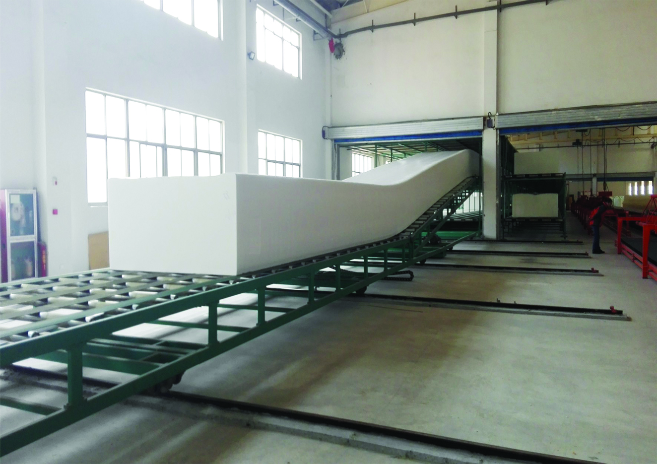 海綿立體倉(cāng)庫(kù)用于儲(chǔ)存剛發(fā)泡出來(lái)未完全熟化的海綿,可以儲(chǔ)存長(zhǎng)條海綿及短泡,可以配套移動(dòng)輸送線或者移動(dòng)倉(cāng)庫(kù),以便可以讓海綿進(jìn)入倉(cāng)庫(kù)的每一個(gè)倉(cāng)位,倉(cāng)庫(kù)每個(gè)輸送線可以獨(dú)立與前輸送線同步,通過(guò)PLC與人機(jī)界面,可以實(shí)現(xiàn)海綿自動(dòng)進(jìn)入指定倉(cāng)庫(kù)和從指定倉(cāng)庫(kù)輸送出海綿,使用此系統(tǒng)可以加快海綿降溫,保證海綿的質(zhì)量,同時(shí)節(jié)省大量人力。